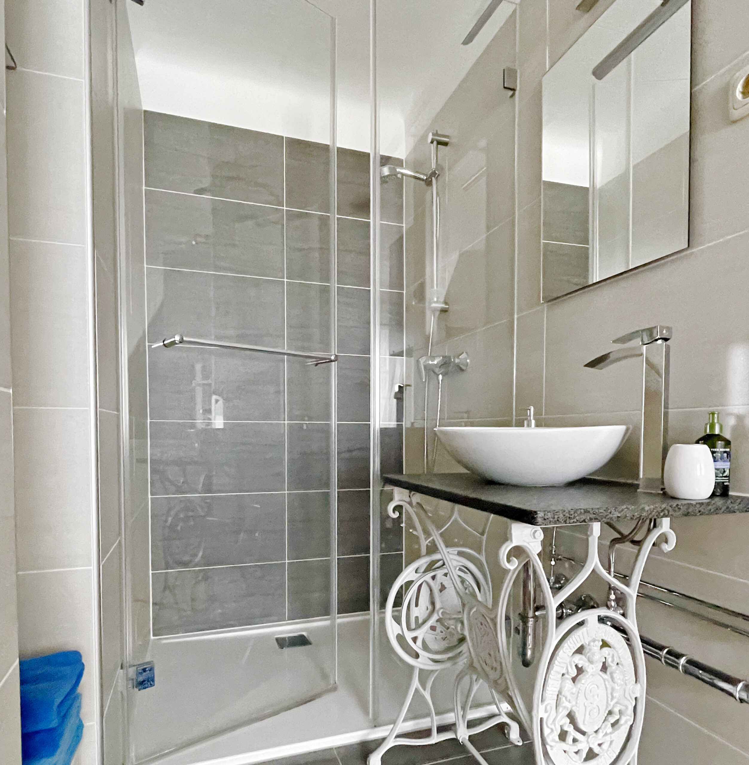Bathroom Essentials: Towels, toiletries, hairdryer, and a spacious shower.